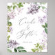 Esta placa de cartões e presentes lilás rústico é perfeita para um casamento de primavera ou verão ou chá de panela de noiva. O design floral romântico e elegante apresenta flores silvestres lilás roxas de aquarela com um sentimento de jardim country boho. A linha de texto na parte inferior da placa pode ser personalizada com a data, os nomes da noiva e do noivo, ou uma mensagem curta como "Obrigado". Esta placa pode ser usada para um casamento ou qualquer evento ou festa.