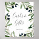 Este sinal de cartões e presentes de ramo de oliveira moderno é perfeito para um casamento ou chá de noiva boho. O design rústico, mas elegante, apresenta folhas verdes botânicas simples em aquarela e azeitonas pretas em um pequeno ramo com um clássico sentimento mediterrâneo. A linha de texto na parte inferior do sinal pode ser personalizada com a data, os nomes da noiva e do noivo, ou uma mensagem curta como "Obrigado". Este sinal pode ser usado para um casamento ou qualquer evento ou festa.