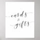 Cartões de casamento e cartazes de mesa de presentes personalizados com "cartões e presentes" em caligrafia manual moderna a preto e branco.