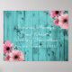 Madeira rústica, sinal de casamento memorial em azul verde - Floral rosa Em Memória Querida recepção cartaz para homenagear entes queridos desaparecidos. Combina com temas de casamento rústicos do interior e temos convites de casamento azul verde, livro de visitas de madeira rústica e outras decorações de casamento coordenadas em nossa loja Zazzle.com/angela65. Madeira rústica, pranchas de madeira de celeiro em azul turquesa ou pranchas de madeira de praia desbotada ao fundo. Lê 'Em Memória Querida dos Que Estão Assistindo de Cima Você Está Para Sempre Conosco' em letra elegante e fontes modernas. Flores rosa e coral adornam o canto superior e inferior. Use o botão Personalizar se quiser alterar algo - texto, estilos de fonte, tamanhos, cores ou posicionamento. Complementa decoração de casamento floral vintage ou casamento no jardim, temas de casamento de madeira de celeiro rústico,