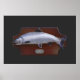 Esta imagem apresenta um troféu de parede Coho Salmão que mostra um Salmão de água fresca com um nome de etiqueta por baixo do peixe montado numa placa de madeira.