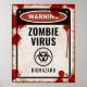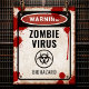 Cartaz com visual retrô com placa de advertência de vírus zumbi enferrujada, símbolo de risco biológico e manchas de sangue.