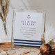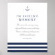 Projetado para combinar com nossa coleção de casamento Nautical Mix, este elegante sinal de estilo costeiro é perfeito para colocar perto de fotos queridas ou uma exposição memorial. Personalize os campos de cabeçalho e texto do corpo (mostrados com "em memória amorosa" e um breve poema), adornado com uma tríade de listras azuis navais e uma âncora no topo.