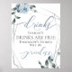 Azul poeirento floral para combinar com o tema do seu casamento, Sinalização engraçada de bar aberto para o seu reception - As bebidas de hoje à noite são grátis, as histórias de amanhã serão impagáveis! . Rosas em aquarela, folhas e bagas em azul poeirento moderno e elegante rodeiam uma moldura prateada em estilo terrário geométrico com folhagem em verde-sage. Personalize o texto, estilo de fonte, cor e tamanho. Arte original criada para a BarefootBride™ por © WhimsicalArtwork™ - Esta é parte de uma Suite de Papelaria de Casamento completa com papelaria de casamento, chá de bebê e outros eventos.