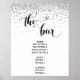 As peças desta coleção apresentam frases proeminentes renderizadas em uma fonte distinta e elegante acentuada com corações, juntamente com um gráfico que retrata confetes prateados. Nesta placa de menu, o texto cursivo diz "the bar". Use os campos do modelo para adicionar seus detalhes e faça desta placa de recepção sua. // 80 //