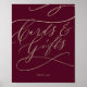 Este letreiro de cartões e presentes com caligrafia em burgundy romântico é perfeito para um casamento simples ou chá de noiva. O design clássico moderno apresenta redemoinhos sofisticados e floreios caprichosos com tipografia elegante e manuscrita em foil dourado de champanhe falso. A linha de texto na parte inferior do letreiro pode ser personalizada com a data, os nomes da noiva e do noivo, ou uma mensagem curta como "Obrigado". Este letreiro pode ser usado para um casamento ou qualquer evento ou festa.