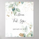 Esta placa de texto personalizado com caligrafia de eucalipto dourado é perfeita para um casamento rústico ou chá de noiva. Este design artístico apresenta folhagem dourada e verde desenhada à mão com aquarela, inspirando beleza natural.