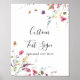 Esta placa de texto personalizado com flores silvestres coloridas clássicas é perfeita para um casamento rústico ou chá de noiva. O design apresenta flores silvestres amarelas, roxas e brancas com folhagem em um fundo de aquarela rosa e verde.