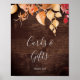 Este outono, folhas de madeira marrom rústico cartões e presentes sinal é perfeito para um casamento de outubro ou chá de noiva. O design rústico do país apresenta folhas de outono pintadas à mão em aquarela em tons de pôr do sol amarelo, laranja queimado e vermelho borgonha que se destaca em um fundo de madeira falsa. A linha de texto na parte inferior do sinal pode ser personalizada com a data, os nomes da noiva e do noivo, ou uma mensagem curta como "Obrigado". Este sinal pode ser usado para um casamento ou qualquer evento ou festa.