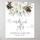 Bem-vindos aos seus hóspedes com encanto sazonal usando nossos Cartões de Pinheiros Elegantes e Sinal de Casamento de Presentes. Apresentando um arranjo lindamente pintado de vergreens foscos, pinecones e florais brancos macios, este signo complementa perfeitamente um casamento no inverno aconchegante. Ele oferece elegância e funcionalidade — orientando os convidados a deixar suas cartas e presentes bem pensados com facilidade. O design clássico combina elementos rústicos da floresta com sofisticação do eterno, fazer ideal para casamentos no inverno, festas de férias ou qualquer evento com tema sazonal.