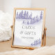 Sinal de casamento no inverno com design de aquarela cênica em tons de lavanda e cinza. A cena da neve apresenta uma paisagem romântica de floresta montanhosa com pinheiros, derivas e um nevão leve. Todo o texto é editável, incluindo o título "Cartões e presentes" e você pode, é claro, mudar os nomes. Se você quiser combinar produtos, por favor, navegue na minha coleção da Floresta de inverno