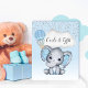 Mostre aos seus convidados onde colocar cartas e presentes no seu chá de fraldas com este adorável design de elefantes bebê. Um é um elefante fofo num balão de ar quente azul com nuvem branca, e eles estão num fundo de gradiente azul e branco com confete prateado.