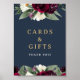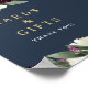 Este cartaz e sinal de presentes apresenta florais robustos e brancos de cor-d-água, um fundo azul marinho e fonte serif clássica. Este sinal é perfeito para o seu casamento no inverno ou evento clássico de marsala. Par com qualquer coisa da Coleção ROSA para um olhar coeso: https://www.zazzle.com/collections/rosa_rich_burgundy_navy_blue_marsala_floral-119005800956334354