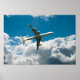 Fotografia de um grande avião comercial branco à medida que voa para cima no céu nublado