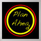 Às vezes, nada funciona como pensamos que vai! Este poster diz-nos para "planejarmos à frente" num círculo negro, com anéis externos de amarelo e vermelho e um fundo preto.