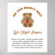 Um design de fralda de chá de fraldas de ursinho castanho. O texto é personalizável. Você pode alterar a fonte, a cor da fonte, o tamanho da fonte, o espaçamento da letra, o espaçamento da linha, a cor do gráfico do ursinho e reposicionar o texto usando a Ferramenta Design.