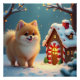 This magical painting features a Pomeranian in a gingerbread village filled with candy and lights. A sweet and imaginative Christmas artwork perfect for holiday decorating.