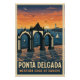 Poster de viagens vintage da Ponta Delgada, Açores, Portugal - a cidade mais ocidental da Europa. Primeiro plano: portões de Ponta Delgada (Portas da Cidade) com arquitetura portuguesa clássica