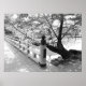 Fotografia branca e preta de uma árvore iluminada ao lado de uma ponte japonesa de madeira.