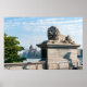 Budapeste, Hungria - Lion da Ponte da Cadeia de Budapeste com o parlamento húngaro em segundo plano