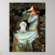 Ophelia (sentada) por John W. Waterhouse (1898), adaptada para incluir um Brinquedo branco ou Poodle Miniatura. A Waterhouse baseou esta pintura na Ofelia de Shakespeare.