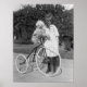 Foto antiga de garotinha fofa com poodle de brinquedo tocado no seu antigo triciclo, 1910.