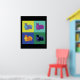 Uma imagem do esquilo fotoomanipulada num estilo de pop art em azul, verde, amarelo, laranja, turquesa e roxo contra fundo preto num poster