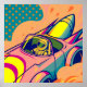 This is a vibrant digital illustration in a pop art style featuring an astronaut driving a futuristic, rocket-powered car. The astronaut, wearing a yellow and white spacesuit with a green visor, is at the wheel of a pink and yellow car with large rocket boosters attached to the rear. Flames and smoke in shades of orange and yellow erupt from the rockets. The background is a teal color with a pattern of orange dots in the upper left and swirling peach and orange shapes. The artwork has a retro science fiction aesthetic with bold colors, thick outlines, and a dynamic sense of speed and adventure.