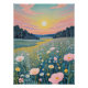Esse trabalho de arte capta uma paisagem serena e mística ao pôr do sol, com uma qualidade de sonho que combina formas naturais detalhadas com uma atmosfera espiritual e etérea. O primeiro plano é um campo vibrante repleto de papoilas e flores silvestres moles, de cor pastel, cada uma reproduzida com um toque delicado e estilizado. Um caminho ou uma corrente sinuosa leva o olho até a distância, onde uma floresta escura e tranquila abraça o horizonte sob um vasto céu pintado em um gradiente luminoso de rosa, pêssego e chalé. Um sol pálido, cheio ou lua pendura no céu, lançando um brilho suave sobre toda a cena. A peça evoca um senso de paz, encanto, e a beleza silenciosa dos ciclos da natureza.