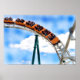 Fotografia de uma porta copos de rolo laranja que corre ao longo da pista contra um céu azul claro