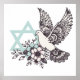 Esta peça impressionante apresenta uma pomba graciosa em voo de médio, suas asas se espalham. A pomba, renderizada em tons brancos suaves com um padrão boho, contrasta lindamente com o pano de fundo de uma estrela azul sólida de David.