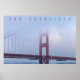 A imagem mostra uma visão parcial da ponte Ouro Gate, muito obscurecida pela neblina. A estrutura laranja-vermelha da ponte é visível, especialmente as torres e o pavimento das estradas. O nevoeiro é denso e branco, envolvendo as porções superiores da ponte e criando uma atmosfera nebulosa. Os cabos de suspensão da ponte são visíveis, desaparecendo no nevoeiro.