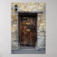 Poster impressão de uma porta de madeira velha em uma fachada de pedra de uma casa com uma luz acima da entrada.