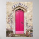Porta rosa/fushia antiga num edifício italiano com pedras e tijolos antigos.