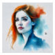 Portrait artistique d'une femme aux cheveux roux-orangés qui se détachent sur un fond d'aquarelle bleu. Le visage présente un teint pâle, des lèvres rouges et un maquillage des yeux prononcé. La composition utilise une technique d'aquarelle moderne avec des couleurs contrastées d'orange et de bleu qui créent une ambiance à la fois vibrante et rêveuse.