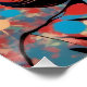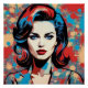 Ce portrait est une œuvre d'art numérique dans le style pop art, représentant un portrait féminin avec une coiffure rétro. L'œuvre présente des couleurs vives et contrastées, principalement du rouge, du bleu et du noir, sur un fond abstrait avec des formes circulaires colorées. Le style évoque les illustrations glamour des années 50-60 avec une touche contemporaine.