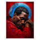 Dieses eindrucksvolle digitale Malerei Kunstwerk zeigt einen emotionalen Moment im Portrait eines Schwarzen Mannes, der seinen Kopf auf verschränkten Armen ruht. Gekleidet in ein tiefrotes Gewand, ist er von einem überwiegend roten Hintergrund umgeben, durchzogen von ausdrucksstarken blauen Farbspritzern.