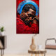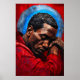 Dieses eindrucksvolle digitale Malerei Kunstwerk zeigt einen emotionalen Moment im Portrait eines Schwarzen Mannes, der seinen Kopf auf verschränkten Armen ruht. Gekleidet in ein tiefrotes Gewand, ist er von einem überwiegend roten Hintergrund umgeben, durchzogen von ausdrucksstarken blauen Farbspritzern.