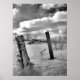 O poster de "Posta na Neve" é uma imagem de dois postes de madeira na neve com densas nuvens peludas em um dia ensolarado no fundo. Feito em preto e branco.
