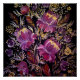 Uma pintura vibrante de flores lilás sobre fundo escuro no estilo tradicional de Petrykivka. A composição apresenta padrões florais complexos, com pinceladas delicadas e varridas que criam senso de movimento e elegância. As flores estão cercadas por folhas de ornamentado e pequenos detalhes decorativos em tons de verde, amarelo e branco, contrastando lindamente com o pano de fundo escuro.