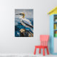 Um poster artístico que representa um espécime de aves marinhas numa rocha acima do mar