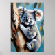Um poster de retrato HD no estilo de pintura que retrata um exemplar de um Koala que permanece pendurado numa árvore com um rosto sorridente e curioso