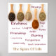 Esta poster tem cinco colheres de madeira amontoando com diferentes especiarias. Palavras em todo o poster, rico vermelho burgundy, dizem "bençãos, bondade, boa comida, risos, abraços e beijos, sorrisos, amizade, compartilhamento, companhia, perdão, generosidade, boas conversas", e, no fundo, lê-se "O tempero da vida" numa cor quente de ouro camelo em fundo branco. Personalize este poster ou comprar conforme projetado. plano de fundo da imagem de estoque www.freepik.com