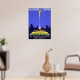 Legal Poster vintage Com Buckingham Fountain Chicago. Céu azul vibrante brilhante com luz neonatal fonte em verde, amarelo e vermelho, com linha do horizonte da cidade ao fundo. Posters WPA de Chicago Lakefront