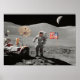 Um astronauta da APOLLO está na superfície da lua perto de um rover lunar com uma bandeira americana plantada ao lado deles. Mas é real, já que a lua é claramente visível no céu distante acima da paisagem lunar.