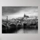 Uma fotografia a preto e branco do Castelo de Praga, vista sobre o rio Vlatva pela Ponte Maioria de Manesuv, aparece nesta poster. Escolha seu tamanho de poster, tipo de papel e acabe e adicione um quadro de sua escolha.