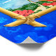 Feliz Feriados das praias arenosas quentes da sua praia tropical favorita. Palmeira decorada com Enfeites de natal e luzes, com uma prancha de surfe retrorreflectora inclinada contra a árvore de Natal, numa armação de bambu.