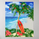 Feliz Feriados das praias arenosas quentes da sua praia tropical favorita. Palmeira decorada com Enfeites de natal e luzes, com um prato de superfície retrorreflector inclinado contra a árvore de Natal.