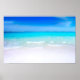 Um poster com uma praia tropical arenosa. Um belo mar de turquesa à distância e águas cristalinas acariciando uma praia arenosa. Um céu azul brilhante no fundo.
