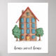 Uma bela placa de casa com ilustração de um prédio de apartamentos e um casal de árvores. Personalize o texto com sua própria mensagem, se necessário. Ilustrada e projetada por Patricia Alvarez.